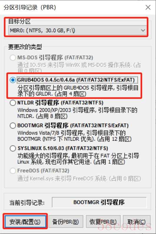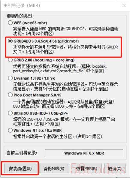 安装/配置,取消勾选“安装Windows NT6 MBR到第二扇区”,选择0.46a版本,然后写入磁盘。