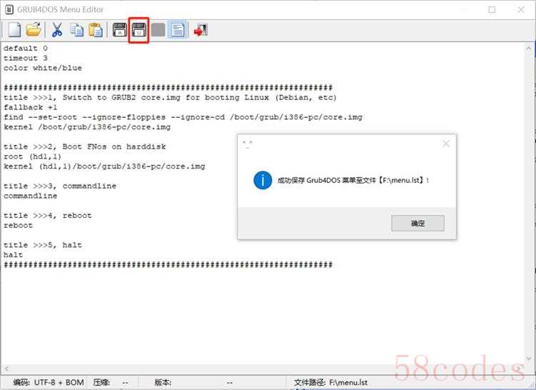 把里面的内容全部删除,复制以下内容到文件里,注意一定要以UTF-8编码保存。default 0timeout 3color white/blue#####################################################################title >>>1, Switch to GRUB2 core.img for booting Linux (Debian, etc)fallback +1find --set-root --ignore-floppies --ignore-cd /boot/grub/i386-pc/core.imgkernel /boot/grub/i386-pc/core.imgtitle >>>2, Boot FNos on harddiskroot (hd1,1)kernel (hd1,1)/boot/grub/i386-pc/core.imgtitle >>>3, commandlinecommandlinetitle >>>4, rebootreboottitle >>>5, halthalt#####################################################################