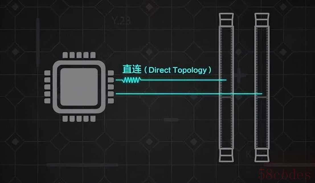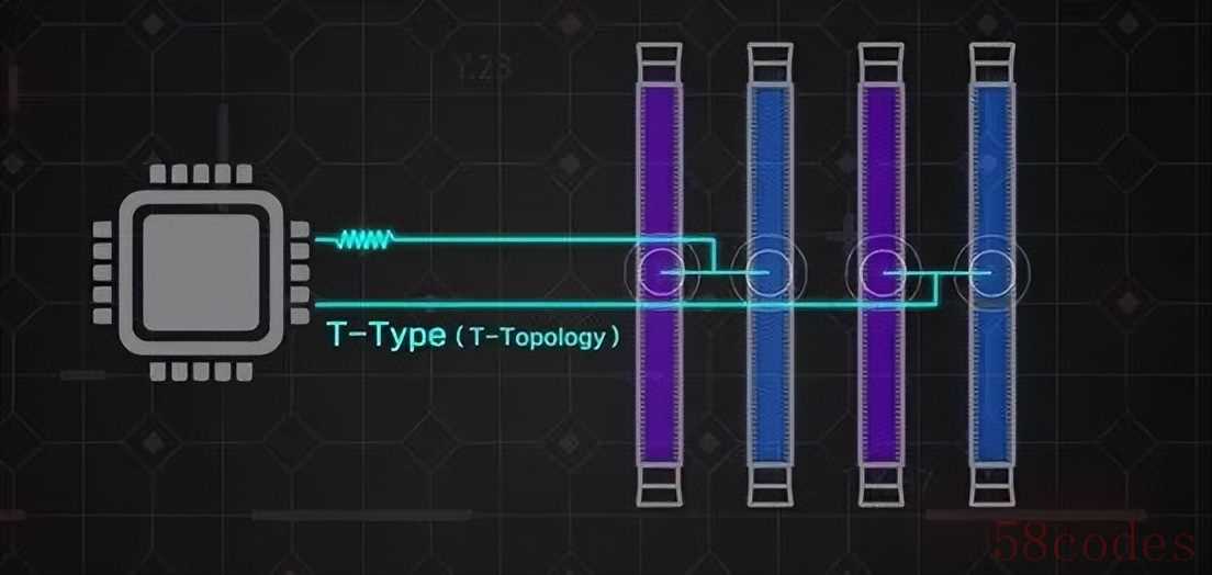 还有一种连接方式是将每个通道先分成两个线路,然后连接到相应插槽上(图8),这叫T型(T-Type)连接,这样四个插槽的线路长度一致,插上内存后的延迟也一样。不过这使得线路延长了,对内存性能有影响,而且一个通道的两个插槽内存信号如果不能完全同步,信号也会更乱。