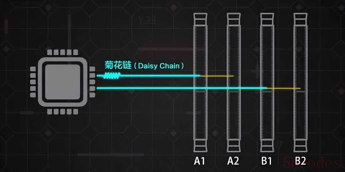 四个插槽时,最简单的方法就是每个通道先连接一个插槽,然后从这个插槽出发“扩展”到第二个插槽(图7),叫做菊花链模式。如果内存分别插入远端的A2、B2插槽,那内存的线路是完整的,没有残缺也没有折回,性能发挥优异;但如果先使用A1、B1插槽,那么延长的空线路就会有干扰。