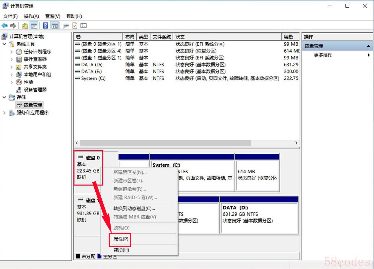 - 在「磁盘管理」界面可以看到电脑安装的所有硬盘设备,如我的电脑就安装有两块硬盘(1块240G的固态系统盘,一块1T的机械盘)。 名称分别为"磁盘0"、"磁盘1"。右键点击要检测的磁盘左侧名称区(如:磁盘0),选择「属性」。