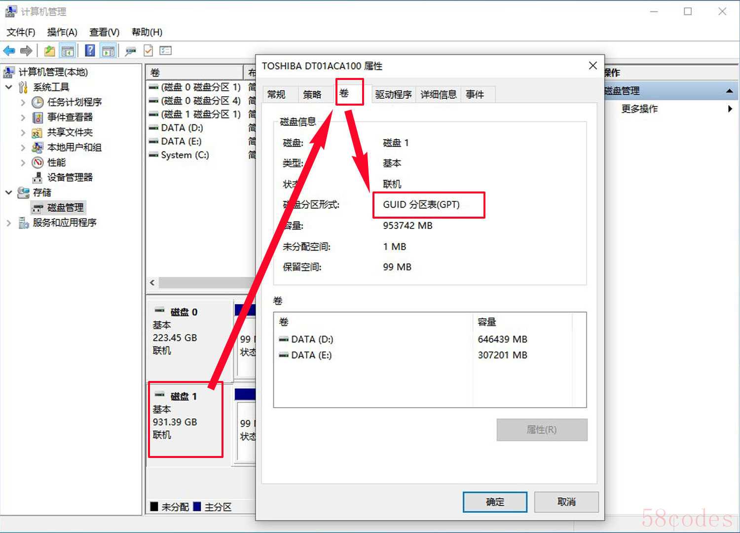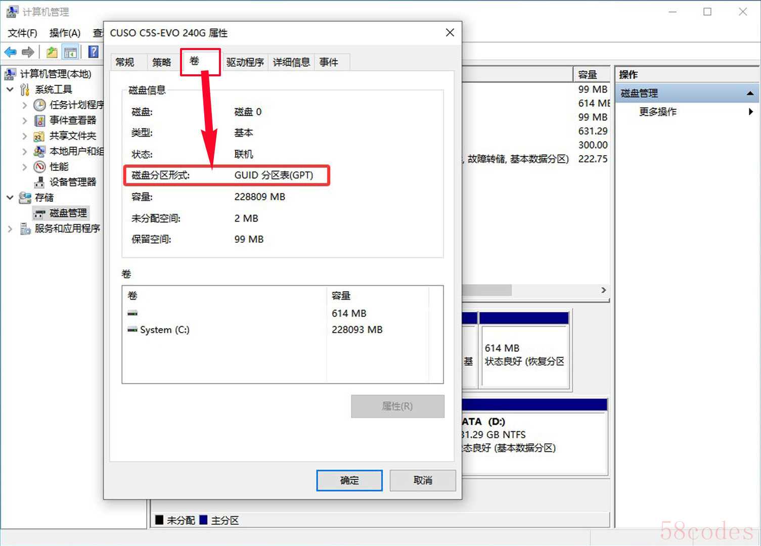 - 在弹出的属性窗口中,切换到「卷」选项卡。看到"磁盘分区形式"了吗?显示【GPT】就是GUID分区表,【MBR】则是传统分区表