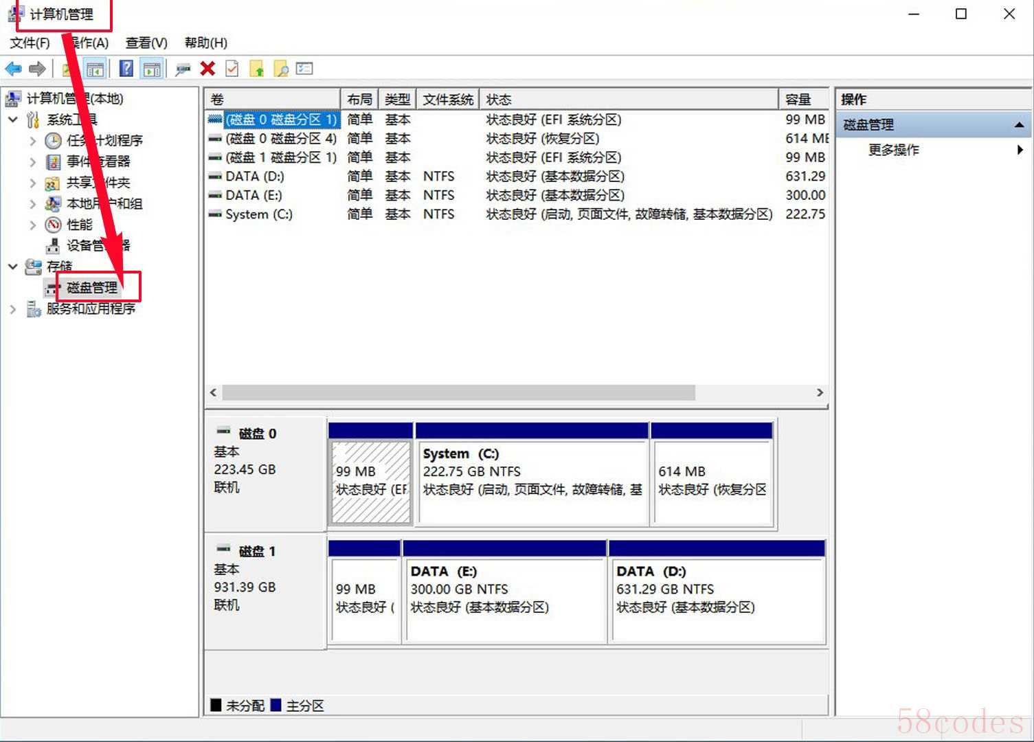 打开磁盘管理后,你会看到列出了你电脑上所有的硬盘和分区。