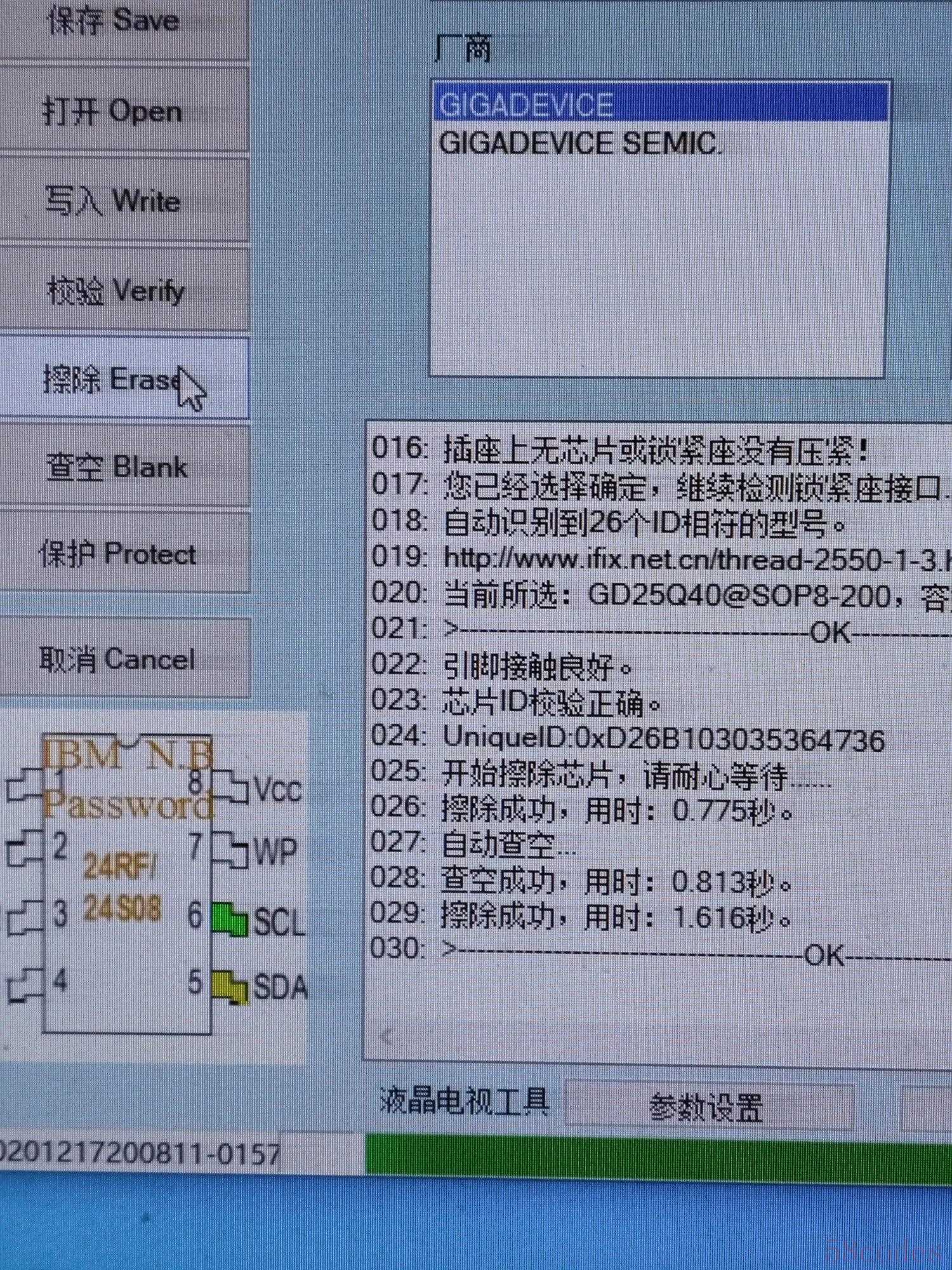 之后我们点击擦除!我这个芯片程序是错误的,不用保存!如果需要保存原本的程序,点击读取即可。