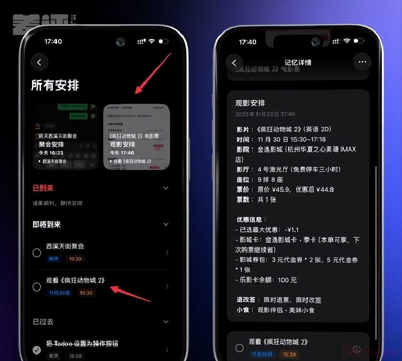 买完电影票,按按钮→Todoo直接识别出“哪个影院、哪个厅、几点”,还把票价+优惠写进备注里。不用再截个图存相册,找半天。