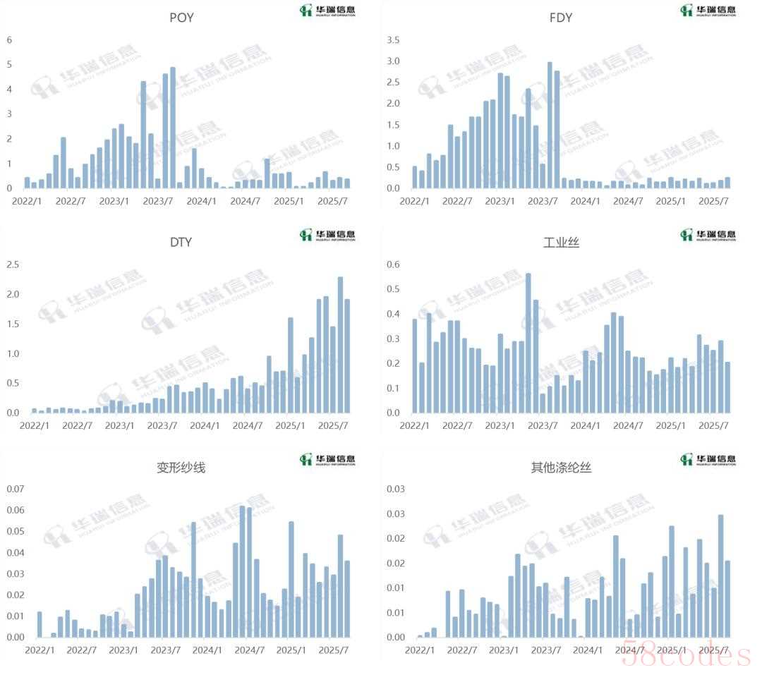 在经历了2024年出口增速的大幅下滑之后,2025年中国到印度的涤纶长丝出口量重回增长态势,1-9月份出口量合计在21万吨,同比增长了5万吨,同比增速达到31%。如此之大的同比增速,一是因为2024年基数偏低,二是得益于DTY品种的贡献。
