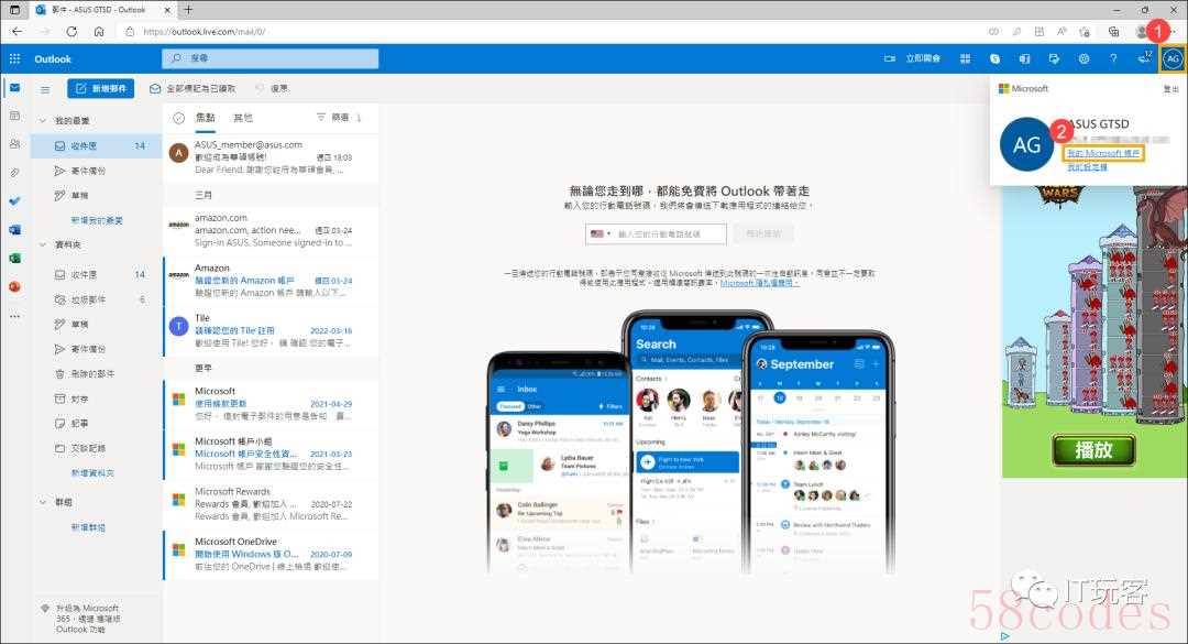https://outlook.office365.com)登入后,点击右上角的帐户图标(1),然后点击 (2)。