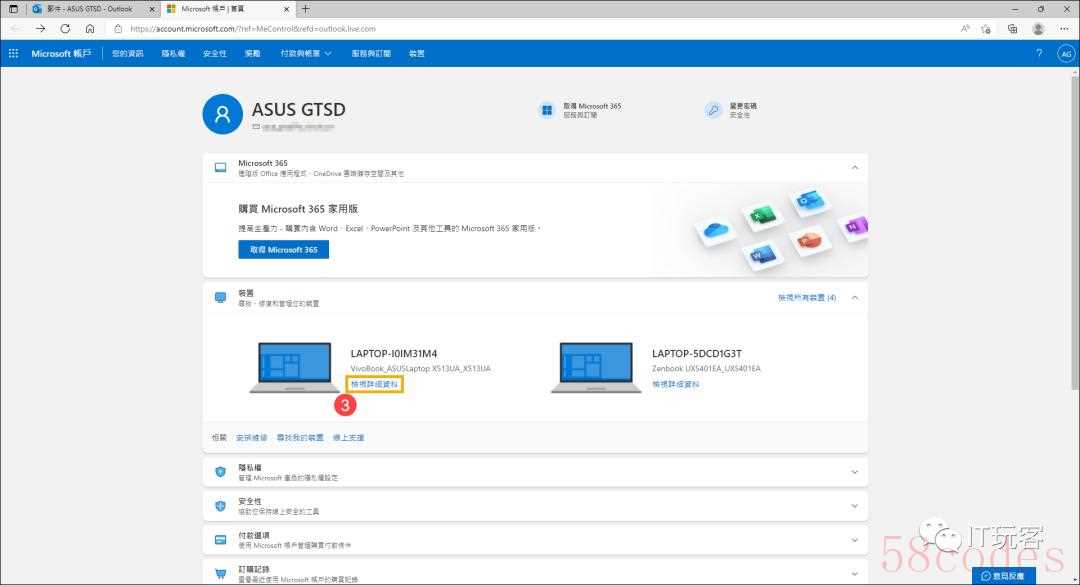 进入帐户信息后,在设备字段中找到您正在寻找BitLocker修复密钥的设备,然后点击查看详细数据(3)。