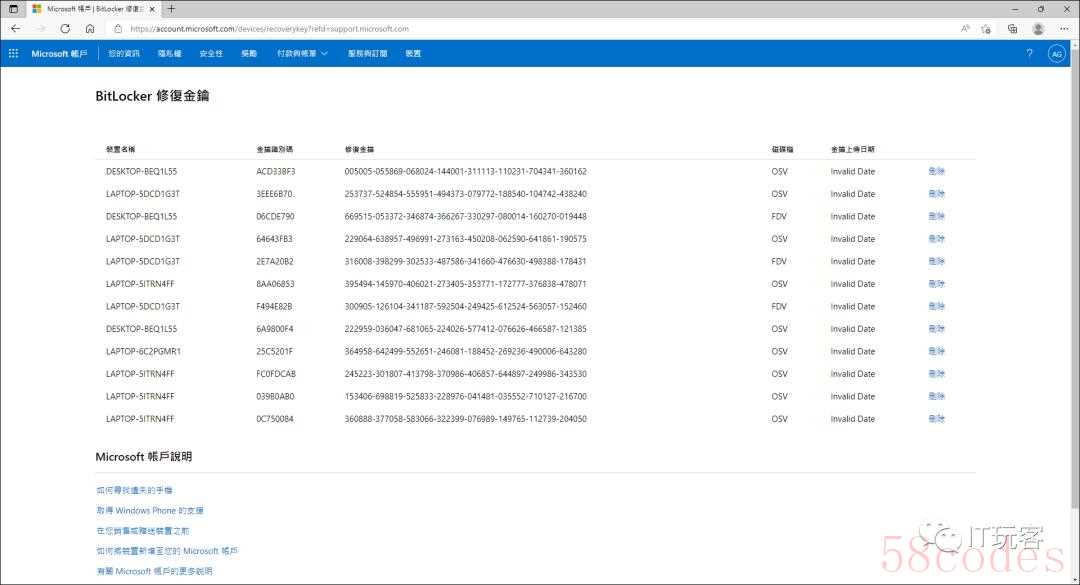 在另一个设备上登录您的Microsoft账户后,将会出现如下画面的BitLocker恢复密钥列表。