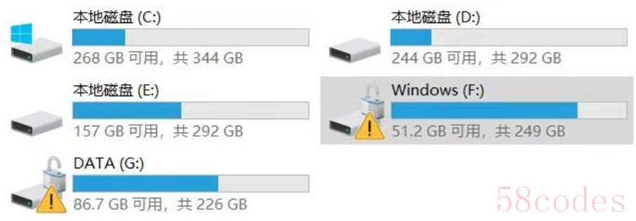 给笔记本加装新固态硬盘后,发现资源管理器中的盘符出现 黄色感叹号+半开锁图标,数据无法访问?