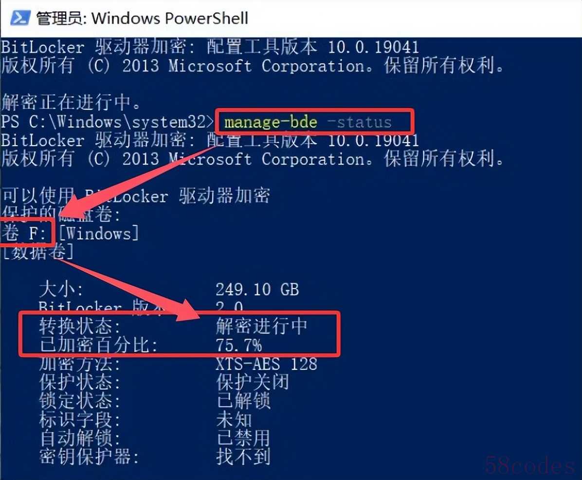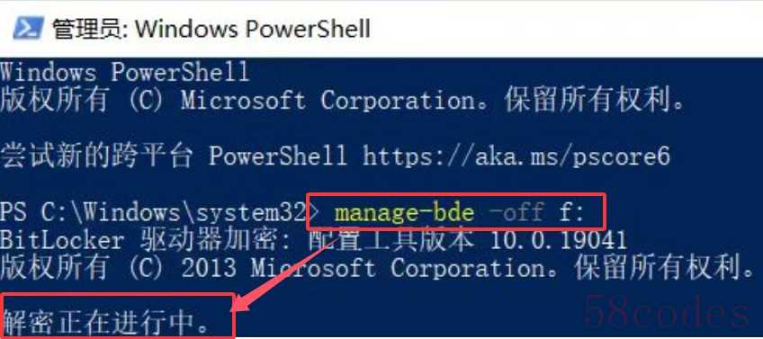 - 在PowerShell界面输入命令:manage-bde -off F: