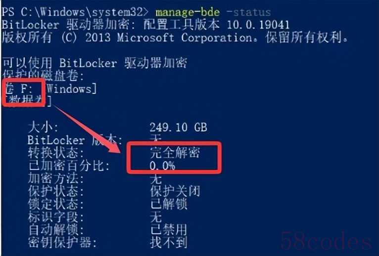 (命令中的f,指的是解密F盘,大家需要根据实际情况修改,比如你要解密D盘,就应输入d)