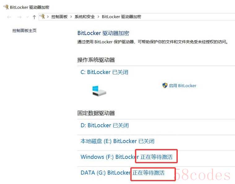 百度查询都说与BitLocker加密有关,但开始菜单——“设置”——“系统”——“关于”——“BitLocker设置”里,显示“正在等待激活”,并无“关闭BitLocker”选项,无从下手?