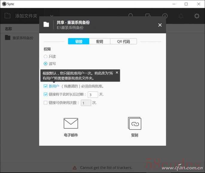 添加共享文件后会弹出这个窗口,在连接选项卡中可以设定只读或读写权限。其中,只读就是别人只能同步你的文件夹但不能修改文件夹里的东西;而读写就是别人也能改这个文件夹的东西,比如新建文件夹、删文件、放文件进去共享等。