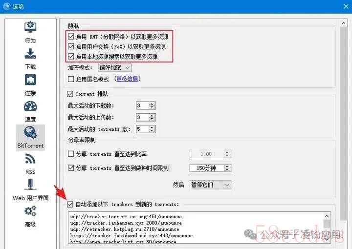 同时,选中“自动添加以下tracker 到新的torrent”选项。