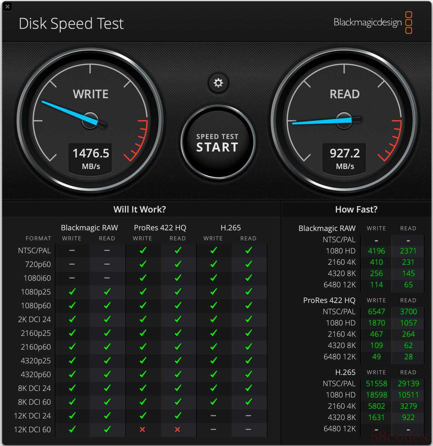 将佰维PM2000移动固态硬盘通过配套线材与MacBook Pro 16 M1 Max笔电的雷电4端口进行连接,并使用 Disk Speed Test 测试硬盘的传输速度,实测写入速度约为1476.5MB/s,读取速度约为927.2MB/s。