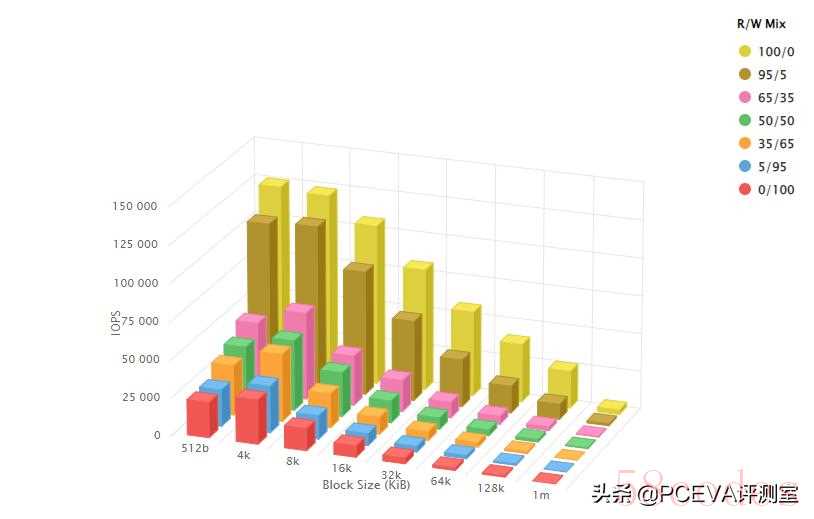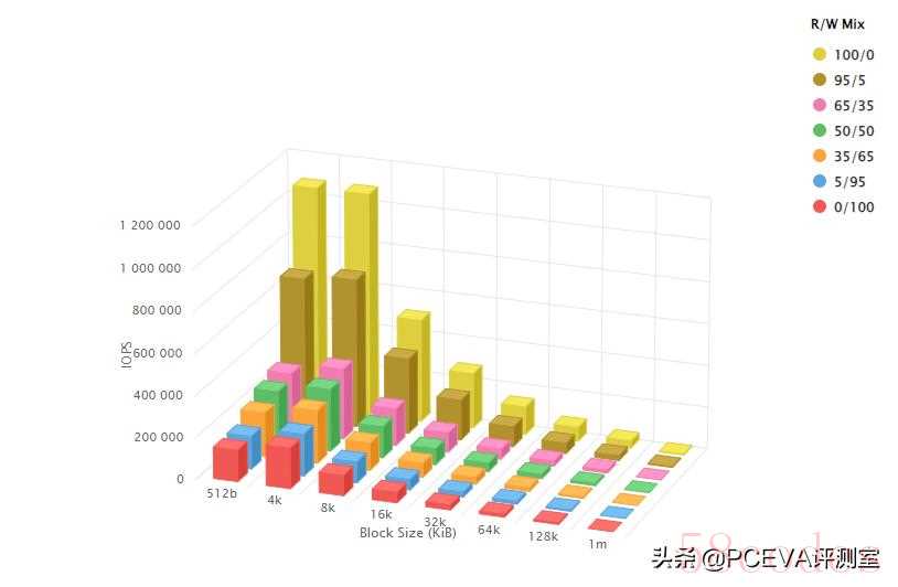 SSS PTS测试的内容包括512字节、4K、8K、16K、32K、64K、128K和1MB块大小,在0/100、5/95、35/65、50/50、65/35、95/5和100/0混合读写比例下的稳定态IOPS,并以数据表格、2D和3D图示三种形式进行展现。首先是DapuStor R5101 3.84TB的成绩: