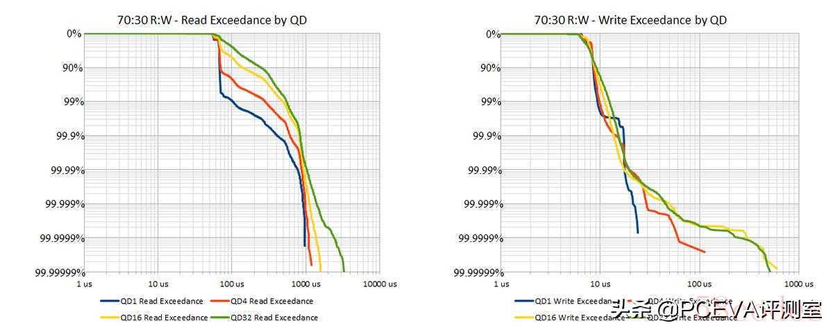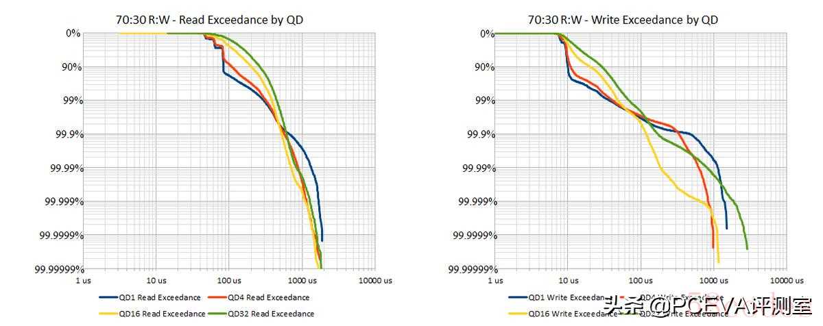 ezFIO脚本还提供了4K混合随机读写的99百分位延迟数据,有助于全面评估SSD在复杂高压条件下的性能一致性表现。图中将读取(左)和写入(右)延迟分开统计,横轴是延迟,越低越好,不同QD下成绩越接近越好。