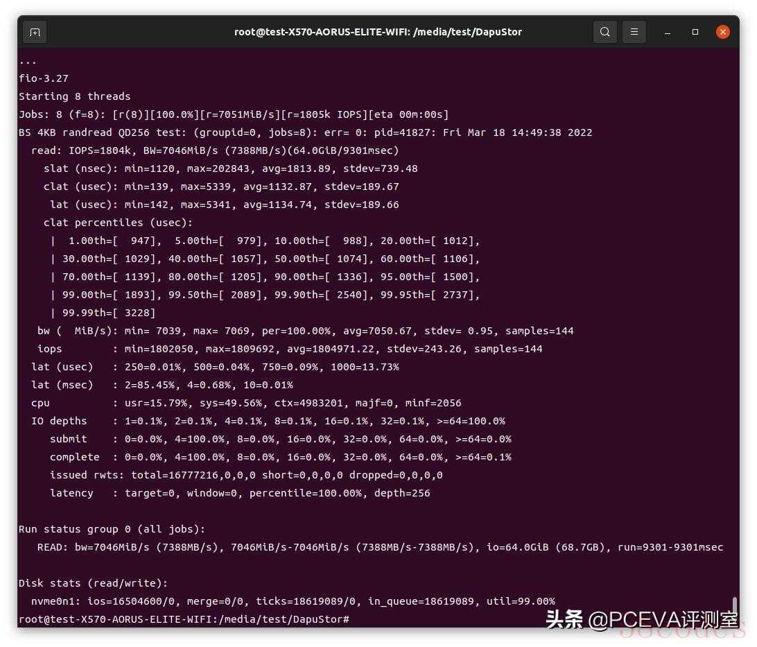 而在Linux系统下,DapuStor R5101通过fio可以轻松跑出1800K IOPS。除了平均延迟之外,fio还提供详细的99百分位延迟信息。虽然很多Linux下的测试工具没有漂亮的图形界面,但性能与功能都比Windows下的同类软件更强,后续的测试也将以Linux系统为主。