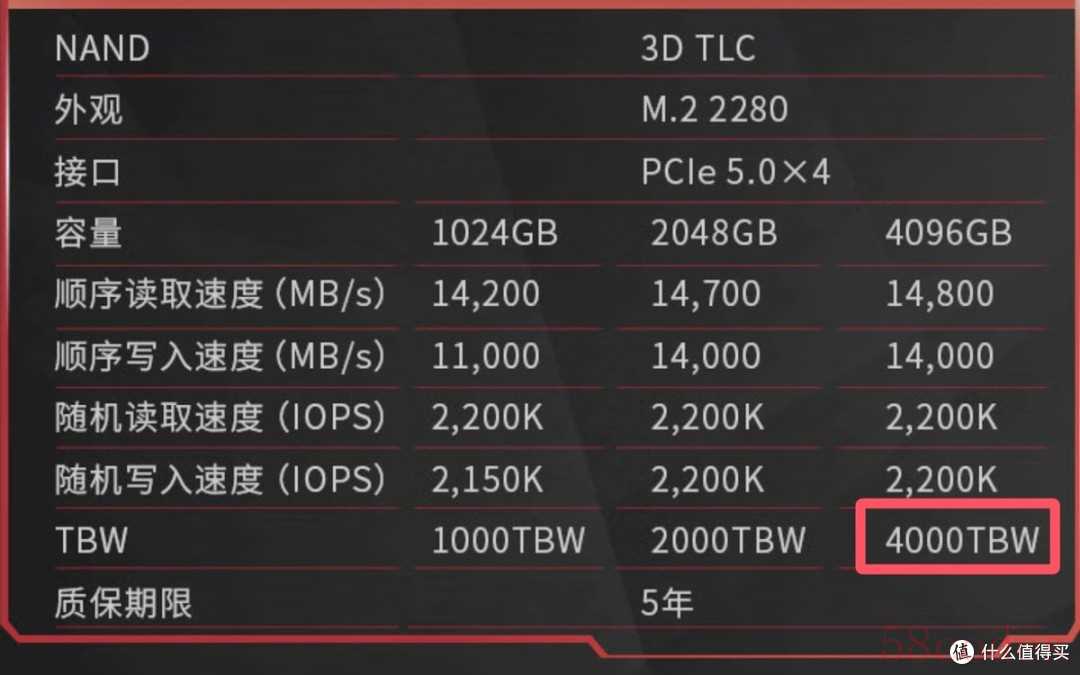 对于最大写入量的部分,直观上来看TBW是跟SSD所采用的闪存颗粒类型(NAND类型)有直接关系,采用不同颗粒的4TB PCIe 5.0 SSD,有的产品标注是2400TBW,有些则是高达4000TBW,问题是我们普通用户不可能为了测试这个TBW是否虚标而进行测试,所以目前我是将TBW作为选购参考依据而不是决定性依据,与其看标注的TBW数据还不入深入了解所用存储颗粒。