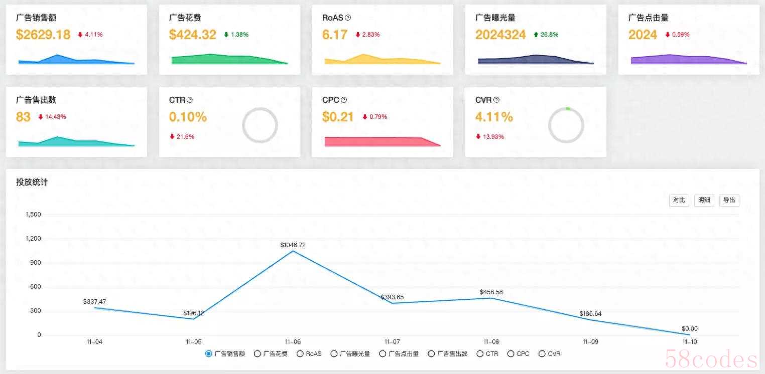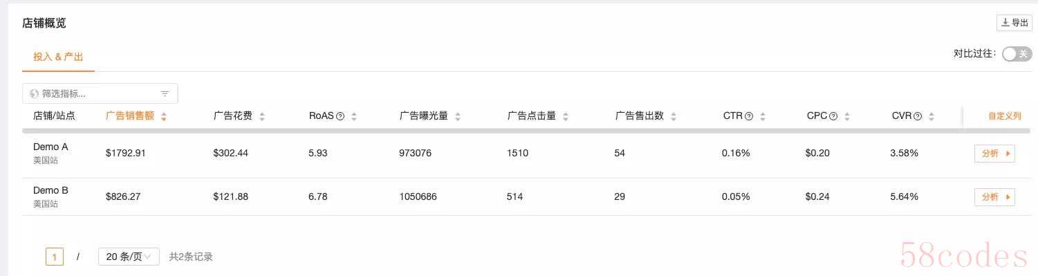 通过数字酋长沃尔玛ERP+BI系统中,卖家可以看到所有店铺汇总的广告销售额,广告花费,ROAS,广告曝光量,广告点击量,广告售出数,CTR总点击率,CPC平均每次点击费用,CVR总转化率等关键广告数据,也可以看到历史数据走势。二、做好各店铺汇总分析