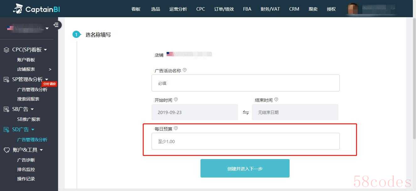 1、进入“船长BI ”后台看板“CPC”,选择SD广告“广告管理&分析”,新建广告活动——编辑广告活动名称——设置时间和每日预算。