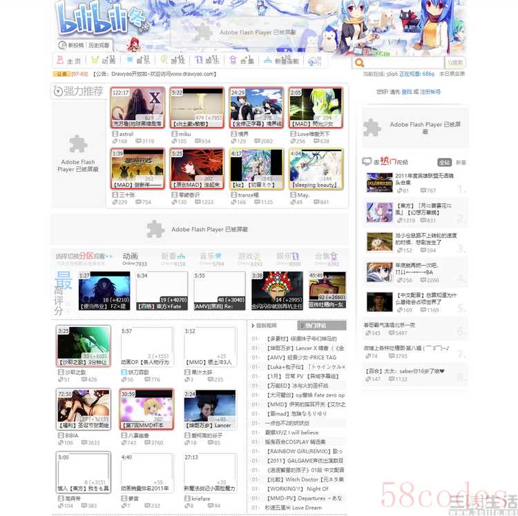 上图是2011年8月31日0点23分06秒的B站,可以看到,当时的其只有“动画”、“音乐”、“游戏”、“娱乐”、“合集”,与“新番连载”等少数几个分区。