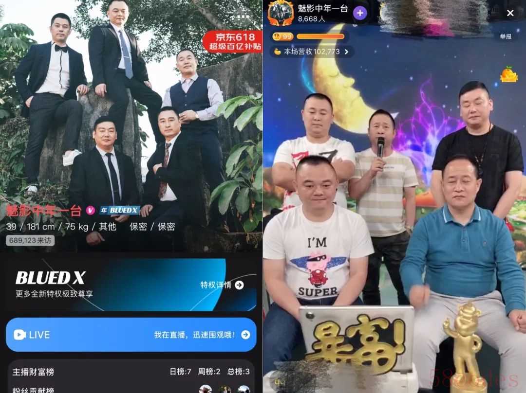 中老年主播团"魅影中年一台",就是在Blued上直播唱歌跳舞的一群男人。这个"团"总共有五位大叔,长相谈不上有多帅气,唱跳水平也只能算业余,但在Blued上却是排名靠前的热门主播。
