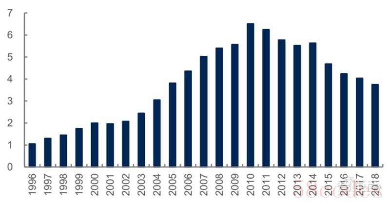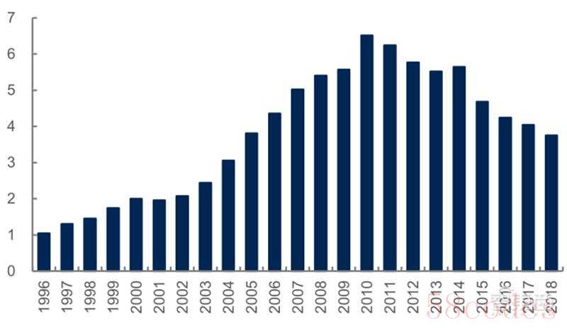 机械硬盘出货量 1996-2010 年稳定增长,从 1996 年的 1.05 亿个增长至 2010年的 6.51 亿个,达到历史最高点。随着存储器的更新迭代,尤其是 SSD(固态硬盘)技术的进步,机械硬盘的地位受到挑战,2011 年开始出货量整体呈现下降趋势,截至 2018 年全球机械硬盘出货量下降至 3.72 亿个。