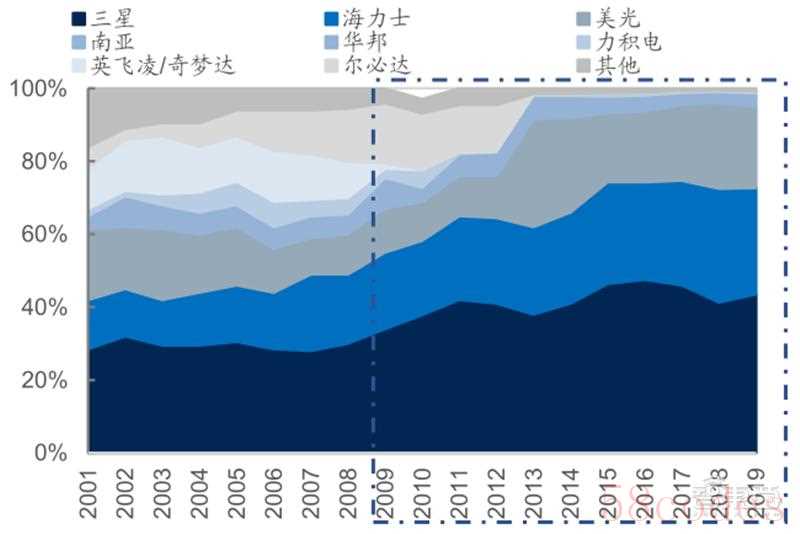 DRAM 战场硝烟弥漫,50 多年的搏杀,目前韩国企业独占鳌头,三巨头成鼎立之势 。近 10 年来 DRAM 市场集中度逐渐上升。DRAM 厂商从曾经的“百花齐放”形成目前的“三国鼎立”局面,三星、镁光、SK 海力士成为 DRAM 领域最终玩家。