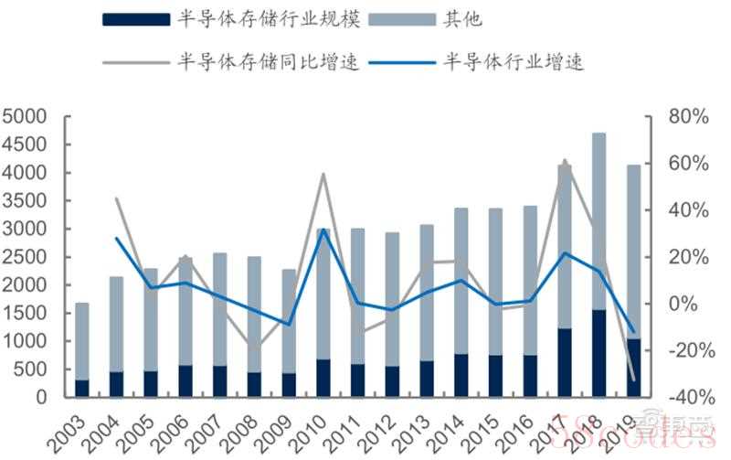 存储器作为半导体的子行业,其周期变化基本和半导体行业周期变化一致,但存储器的波动性更强。因此,当半导体行业处于景气周期时,存储器市场表现更佳,以 2017 年为例,半导体行业规模同比增长 21.62%,存储规模同比增长高达61.49%。而当半导体行业处于不景气状态时,存储市场亦会表现更不理想,以2019 年为例,半导体行业规模同比下降 12.05%,但存储市场下降高达 32.62%。