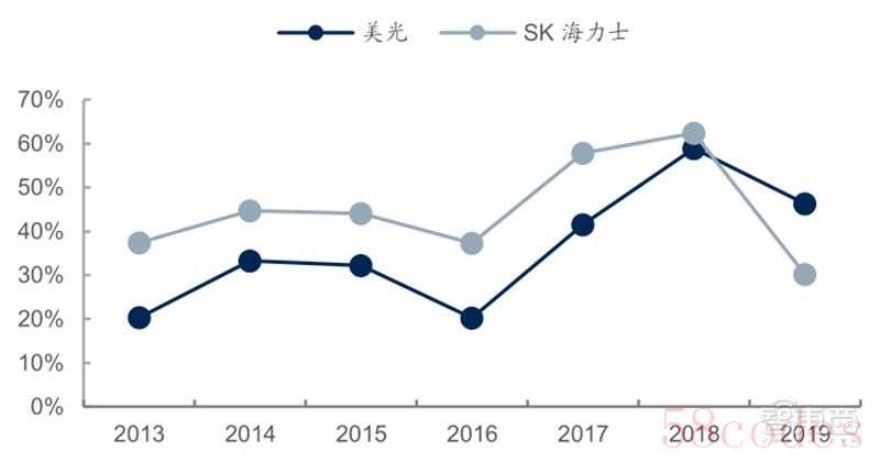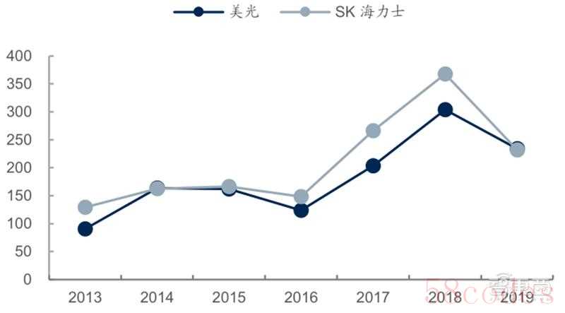 从镁光和 SK 海力士的经营情况看,2015-2016 年 DRAM 价格下降较快,两者毛利率均比较低迷。2017-2018 年受益于数据资料中心、智能手机等需求的增长,以及厂商对供应量的控制,DRAM 量价齐升,营收增长,毛利率增长。2019年营业收入同比下降,主要原因是前期产能扩张和去库存等。