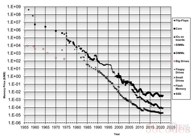 随着技术的发展,存储器尺寸逐渐缩小, 存储容量大幅提升,单位GB 存储价格迅速下降。1960 年代,磁带平均容量仅为 2.3MB,而每 GB 价格却高达 1791英镑,1970 年代流行的软盘价格更是高达 2-3 万英镑/GB。伴随着硬盘技术的发展及普及,存储价格迅速下降,1990 年代,单位 GB 存储价格跌至 100 英镑以下,CD-ROM 价格仅为 6.03 英镑/GB。21 世纪开始,DRAM、闪存进入人们视野,成为主流存储方式,存储价格进一步下降,单位 GB 存储价格平均为0.5-0.8 英镑。