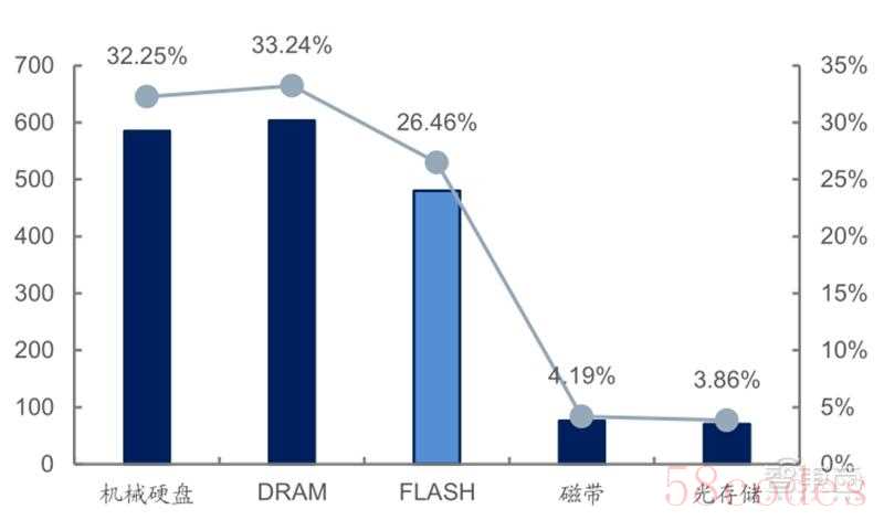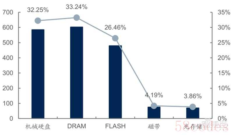 信息存储的需求基石,来源于文明传承与延续,随着世界数字化趋势而爆发增长。按照存储介质的不同,现代数字存储主要分为光学存储、磁性存储和半导体存储三类。从存储市场规模来看,2019 年机械硬盘市场规模约为 585 亿美元,占据总体市场的 32%;DRAM 市场规模约为 603亿美元,占 33%;FLASH 市场规模约为 480 亿美元,占 26%。
