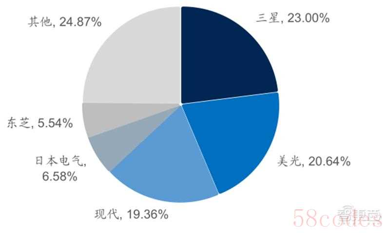 而纵观 DRAM发展历史,本身 DRAM 产品在成本、技术、品质等为核心竞争要素,而背后需要企业在融资能力、产业链配套及人才梯队等全方位储备,考验企业系统性的资源调动能力。DRAM 厂商从曾经的“百花齐放”形成目前的“三国鼎立”局,三星、镁光、 面,三星、镁光、SK 海力士成为 DRAM 领域最终玩家,三家合计市场份额达 领域最终玩家,三家合计市场份额达95%, 而各家分别为 43.5% ,29.2%和 和 22.30% 。