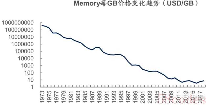 在过去 50 多年里,存储每 GB 价格总体呈现每 4~5 年价格变为 1/10,近年来 ,价格下降趋势有所缓和。1973 年存储每 GB 价格约为 3.22 亿美元,数据存储成本极高。随着存储技术的进步以及美、日、韩厂商之间的激烈竞争,存储成本下降,2018 年每 GB 价格仅为 7.26 美元。