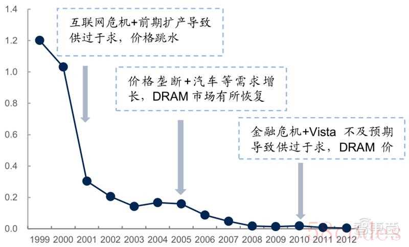 2010 年以后,三星、海力士形成三国鼎立局面。2014-2015 年,三大DRAM 厂商为提高自身市占率,继续大打价格战,DRAM 价格不断下跌。