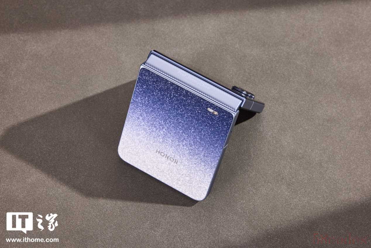 IT之家拿到的这款荣耀 Magic V Flip2 高定款继续由国际时尚大师、Professor Jimmy Choo 周仰杰博士亲自操刀设计,采用蓝紫和银色渐变而成的织梦蓝配色,配合细腻的喷砂工艺处理,直接将 Jimmy Choo 水晶鞋上闪耀夺目的华丽效果做到了手机上,如果平时就喜欢闪粉效果,那么这款织梦蓝配色的荣耀 Magic V Flip2 高定款一定很适合你。