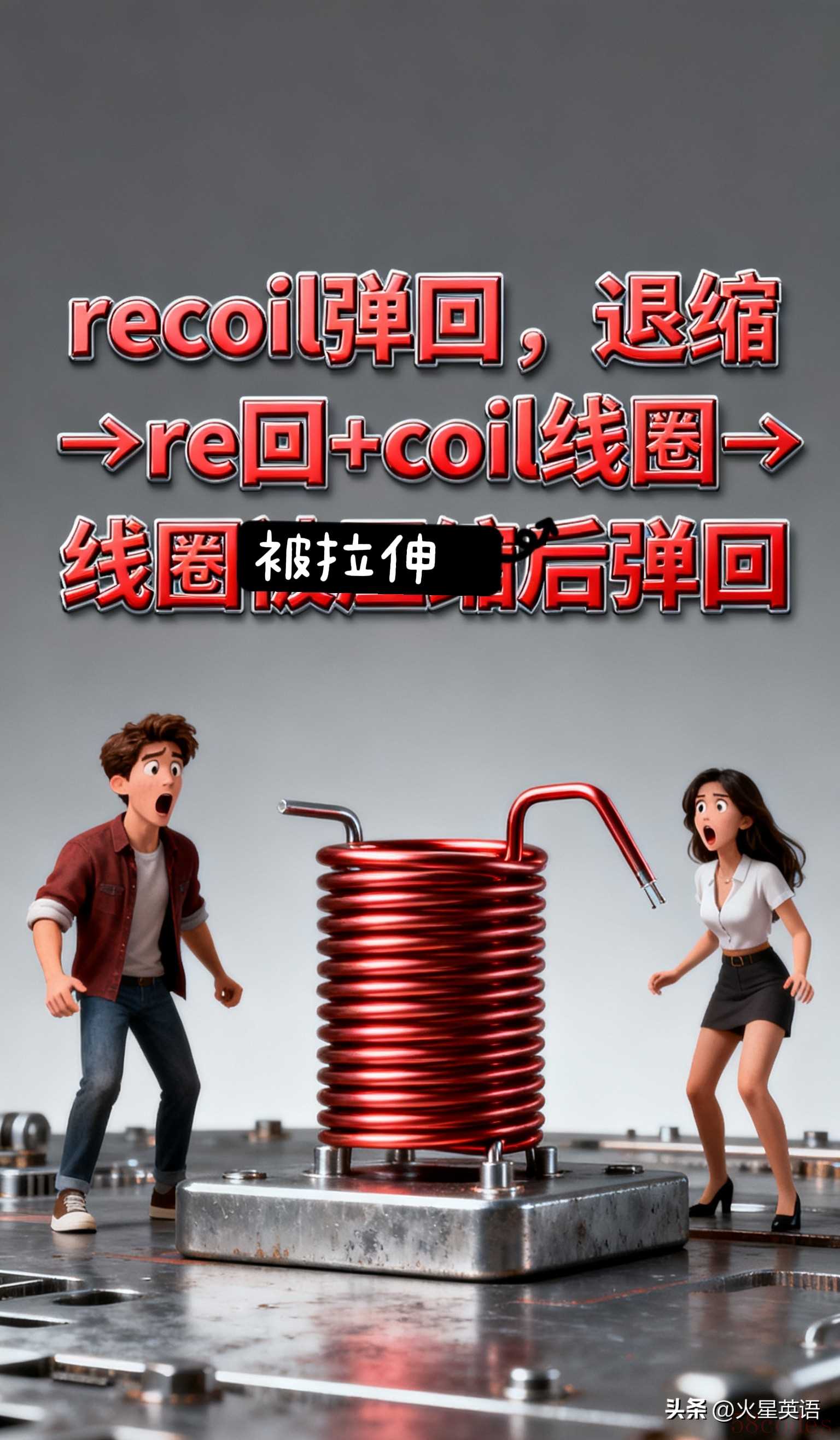 “Recoil”一词读作/rɪˈkɔɪl/,核心含义为“退缩”与“弹回”,其构词逻辑清晰易懂——前缀“re-”表示“向后、反向”,如“return”(返回)、“rebound”(反弹);词根“coil”指“线圈”,可借助“coin”(硬币)联想记忆:硬币是单个圆形,线圈则是多个圆形叠加,立体感十足。将“re-”与“coil”拼接,便能构建出“线圈反向弹回”的动态场景,既贴合物理反冲的力学规律(如弹簧拉伸后反弹回去),也精准对应心理层面的退缩反应(如因恐惧而本能收缩)。