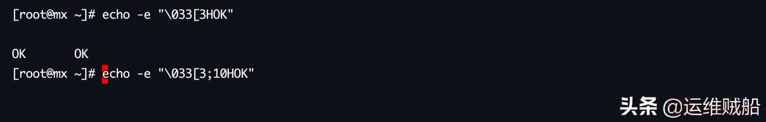 2.echo默认的命令有些单调,默认以黑色字输出、无法居中展示。echo 命令支持-e 选项,使用该选项可以让 echo 命令识别后面的转义符号含义,其中033 或e 后面可以跟上终端编码,终端编码可以用于定义终端的字体颜色、背景颜色、定位光标等,从而丰富我们的使用体验。