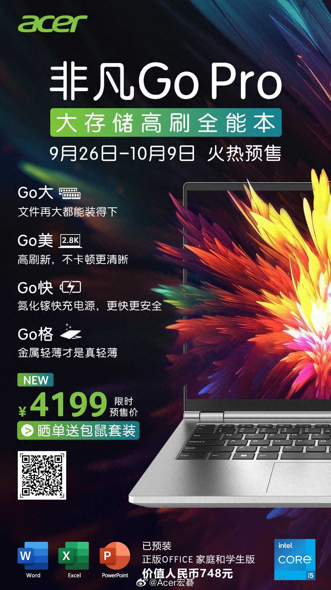 IT之家 9 月 26 日消息,宏碁非凡 Go Pro 笔记本电脑现已开启预售,首发价 4199 元,将于 10 月 9 日付尾款。