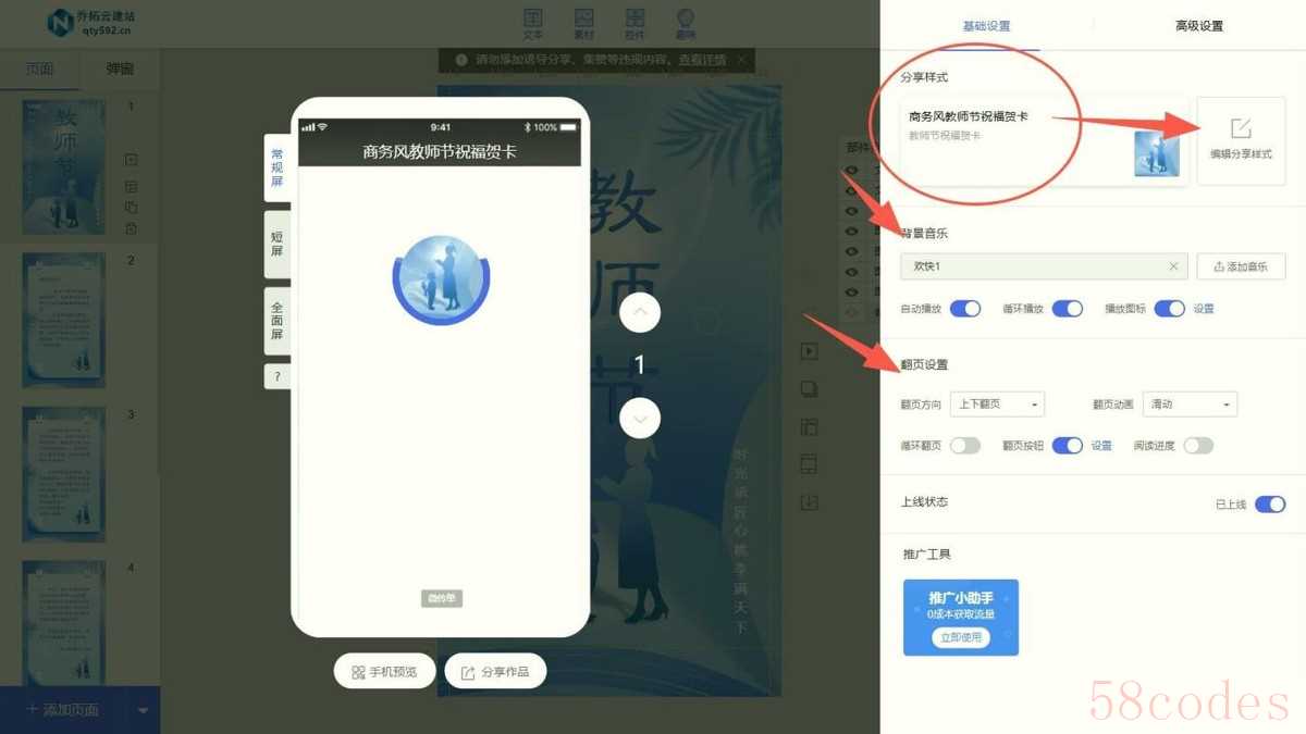 而且基础功能都不用额外花钱解锁,特别实用。想加背景音乐?在顶部导航栏点 “音乐”,挑首喜欢的加上,还能设自动播放;想让翻页有意思点,去 “设置” 里选翻页动画,滑动、翻转啥样式都有,不用写一行代码,就能做出有点电影感的效果。做好之后生成二维码或者链接,直接分享到微信、朋友圈,特别方便。