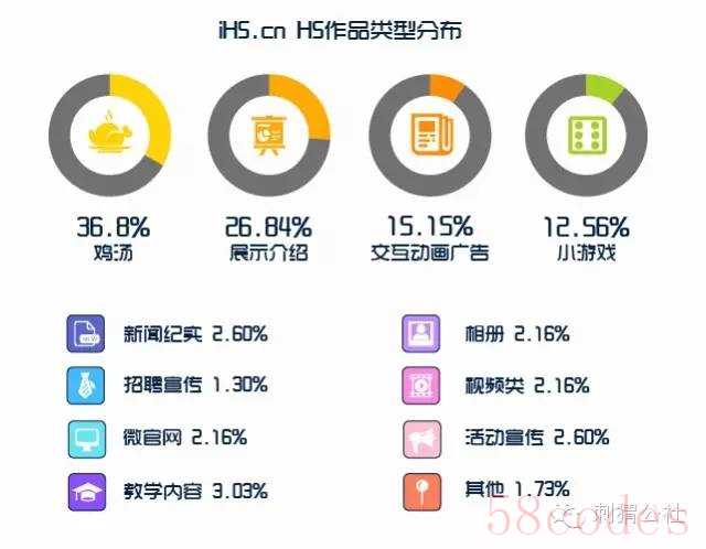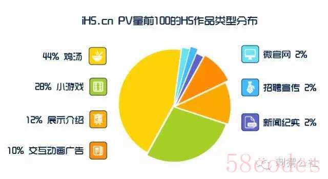 iH5平台上PV量(page view,页面浏览量,或者点击量)排名前100的作品中,鸡汤、小游戏(44%,28%)都比它们在全部H5作品中的占比(36.8%,12.56%)要高。