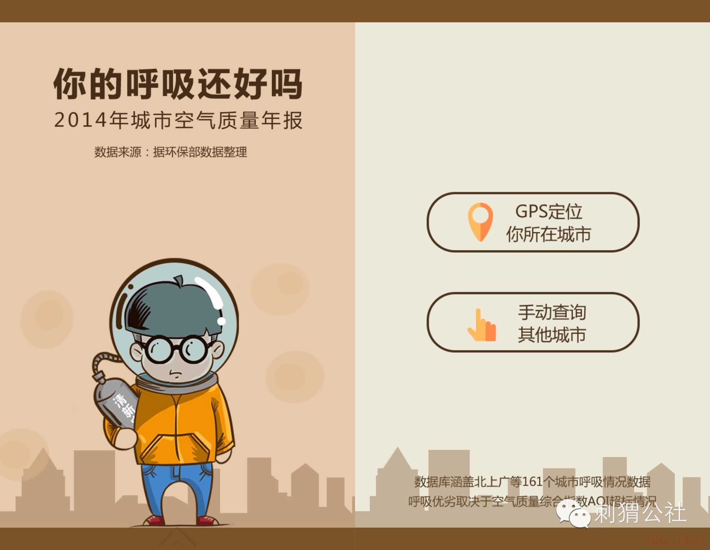 这个H5切合热点(柴静《穹顶之下》发布),基于用户对雾霾的担心,迎合网友越来越关注空气质量的需求,在环保部公开空气质量数据之后,提炼数据,运用LBS技术(基于位置的服务),通过用户直接定位做出相关的空气大数据排行与分析。在环保部公开空气质量数据之后,提炼数据,运用LBS技术(基于位置的服务),通过用户直接定位做出相关的空气大数据排行与分析。
