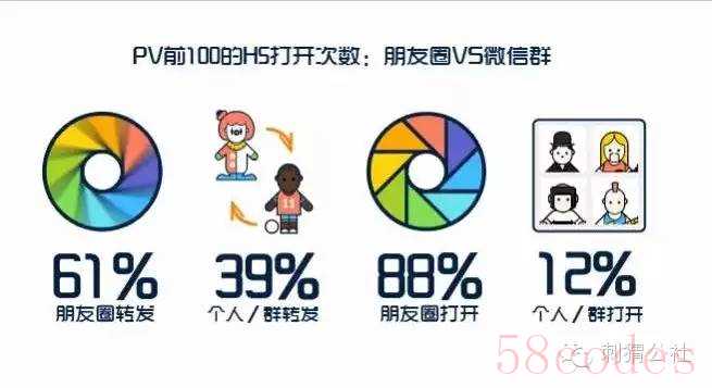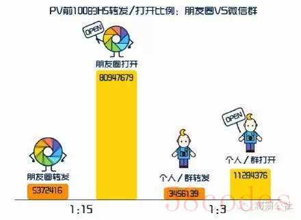 61%的H5作品是通过朋友圈转发的,88%的PV量来自朋友圈,有更多的人通过朋友圈看到H5页面并且打开,朋友圈的转发/打开比例是1:15,而个人和微信群的转发/打开比例是1:3(个人打开包括公众号推送打开和收藏打开),这意味着一个人把H5页面转发到朋友圈,则有15个人左右选择打开这个H5页面,个人转发到个人或者微信群则只有3个人会点开,朋友圈转发传播效果更好。