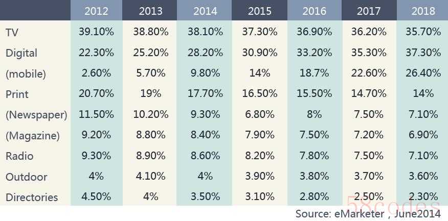 然而这不是偶然,而是趋势。在具体介绍H5营销之前,我想和大家分享一份eMarketer的数据,其中显示了2012年-2018年品牌在不同媒体渠道的预算比重: