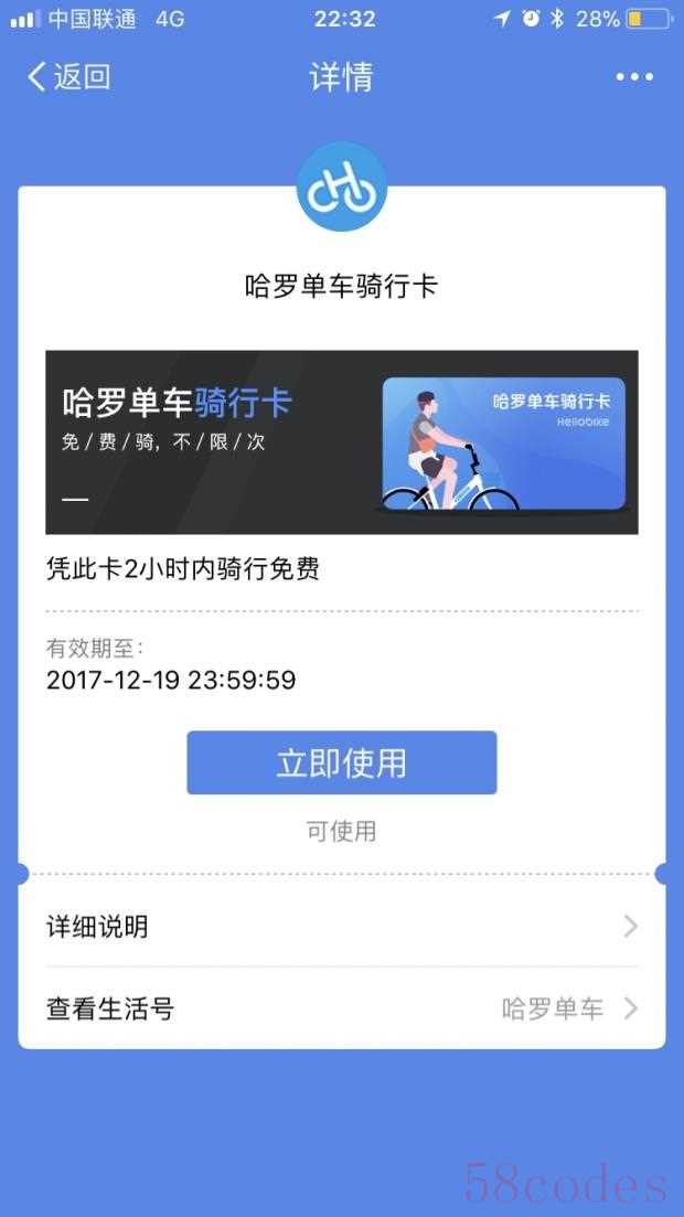 除了扫码开锁、搜索等入口,现在“哈罗单车”在支付宝上提供了一种新的使用方法:用户在哈罗单车小程序里领取骑行卡后,会自动同步到用户支付宝首页的“卡包”中。如此一来,骑行族不仅可以通过 “卡包”快速查询骑行卡的有效天数,还能通过骑行卡快速进入哈罗单车小程序。