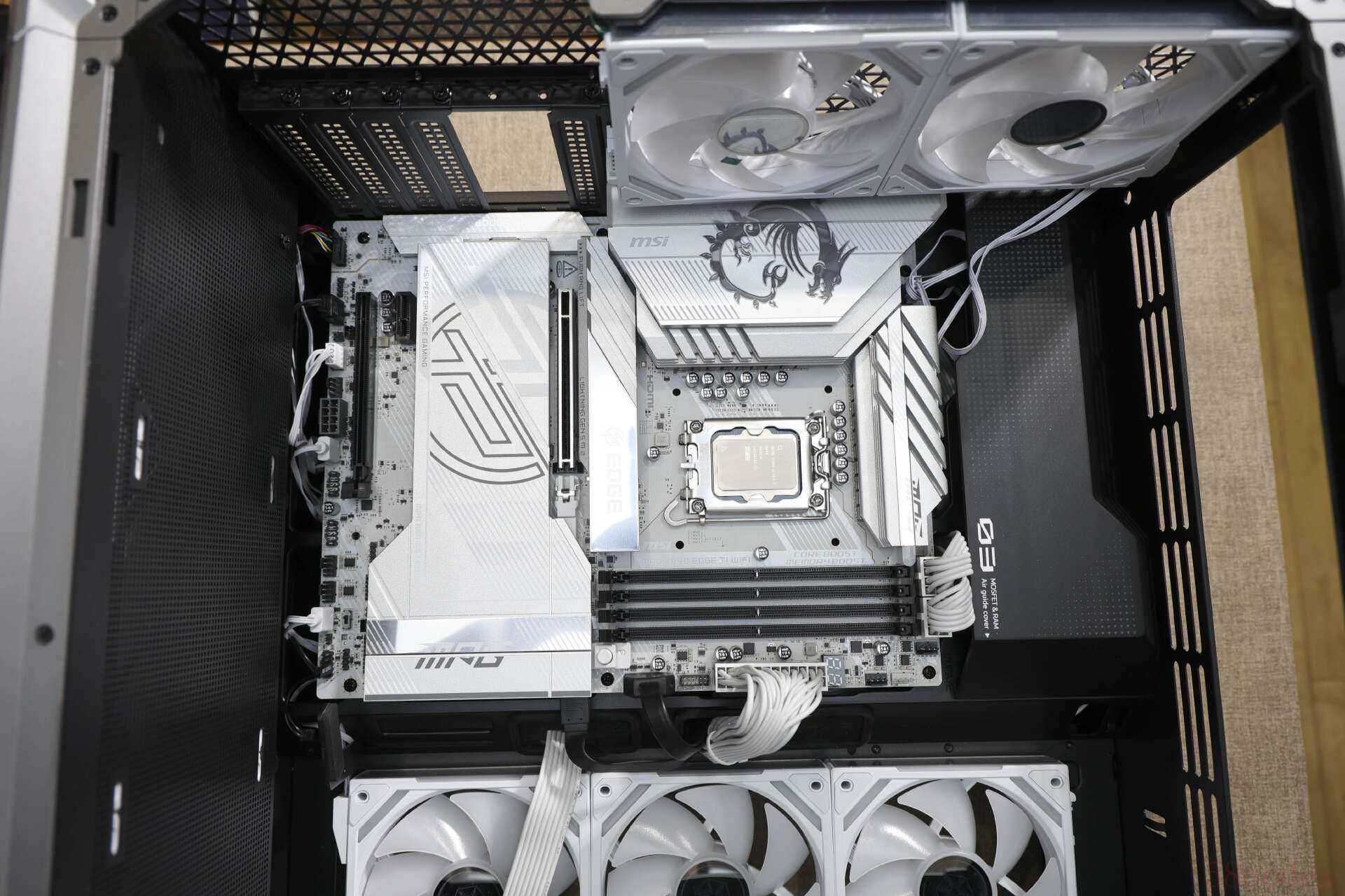 主板方面,我选择的微星MPG Z890 EDGE TI WIFI刀锋钛,内置高品质导热垫和直触式导热热管的扩展型VRM散热片提供了极佳的散热表现。四根DDR5内存插槽兼容最新CUDIMM内存,支持最高9200MHz OC频率。