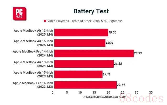 MacBook Air 13@M3竟然以21:38的续航时间,战胜了MacBook Air 13@M4。据悉,MacBook Air 13@M4应该属于套娃升级,与MacBook Air 13@M3可以说是基本无区别。