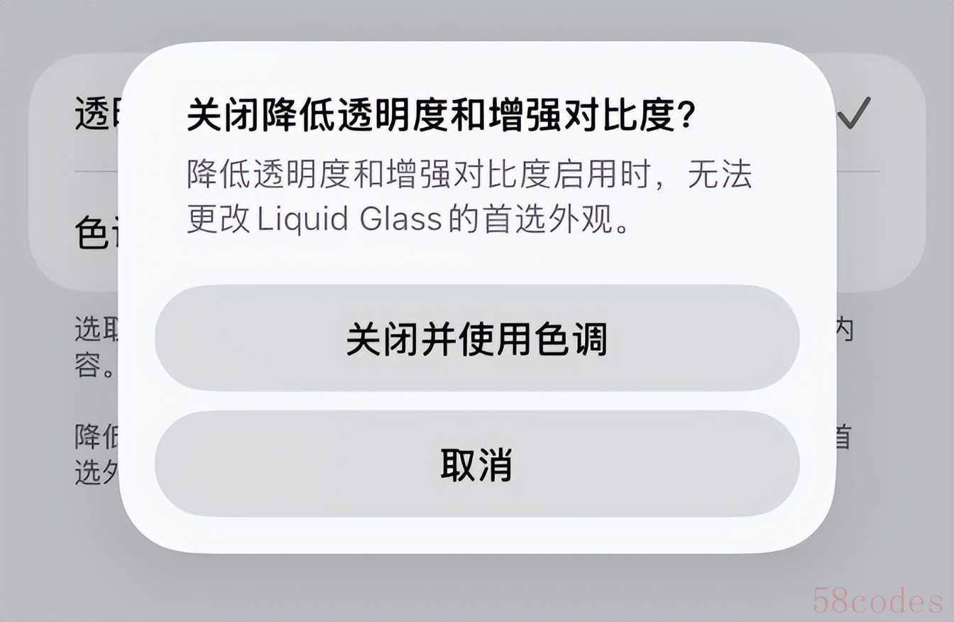 20、如果已启用降低透明度、增强对比度选项时,如果再去切换液态玻璃色调风格时会给出提示。